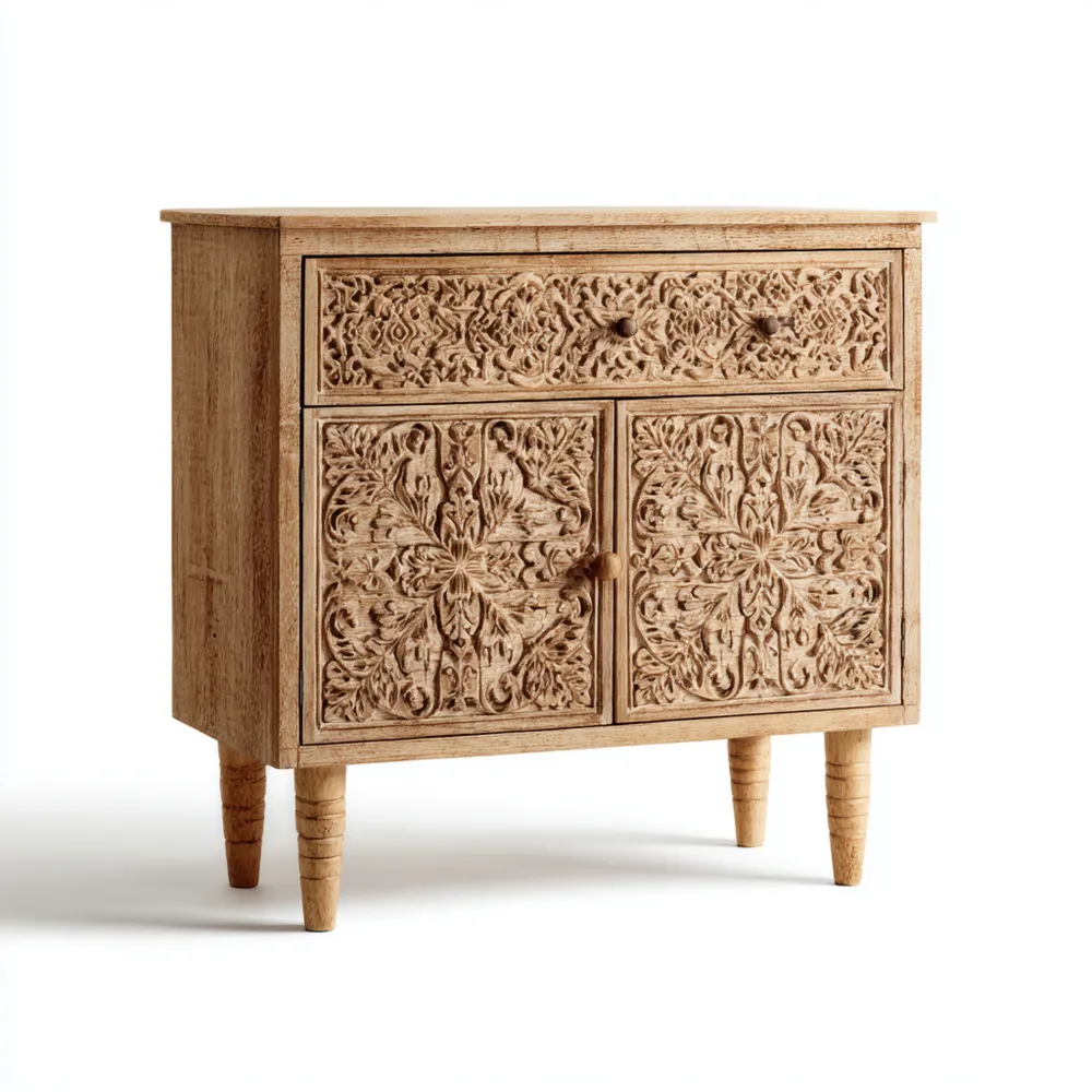 Matériau et FabricationFabriqué en bois naturel avec une finition sculptée à la main, ce meuble dégage une chaleur et une durabilité exceptionnelles. La couleur Bois Naturel accentue ses détails artisanalement sculptés.